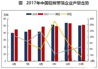 據(jù)我的有色網(wǎng)對(duì)全國(guó)40家鋁板帶箔企業(yè)調(diào)研數(shù)據(jù)顯示,2017年11月中國(guó)鋁板帶箔企業(yè)產(chǎn)量為51.35萬(wàn)噸,較10月份減少了6.91%,較去年同期相比增加1.83%。1-11月份共生產(chǎn)532.5萬(wàn)噸,較去年同期相比增加了5.43%。11月鋁板帶箔企業(yè)開工率為71.05%,環(huán)比下降1.35個(gè)百分點(diǎn)。其中,該40家樣本企業(yè)共計(jì)產(chǎn)能872.2萬(wàn)噸,占全國(guó)總產(chǎn)能的71.55%。